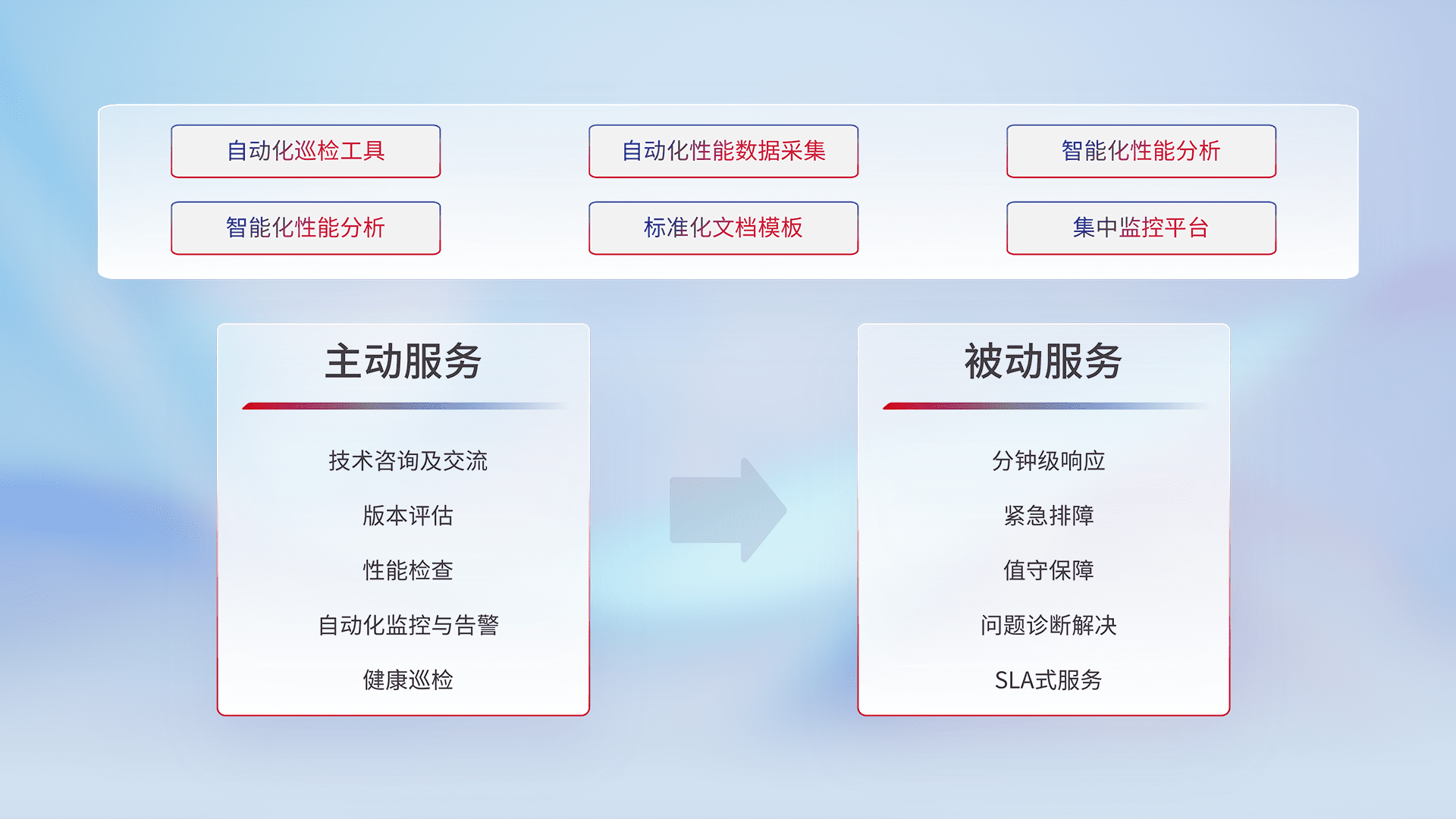 智能化工具和标准化文档,,,保障服务质量,,,提供主动服务(包含技术咨询、、、版本评估、、性能检查、、、、自动化监控与告警、、健康巡检)和被动服务包含(分钟级响应、、、、紧急排障、、值守保障、、问题诊断解决、、SLA服务)。。。